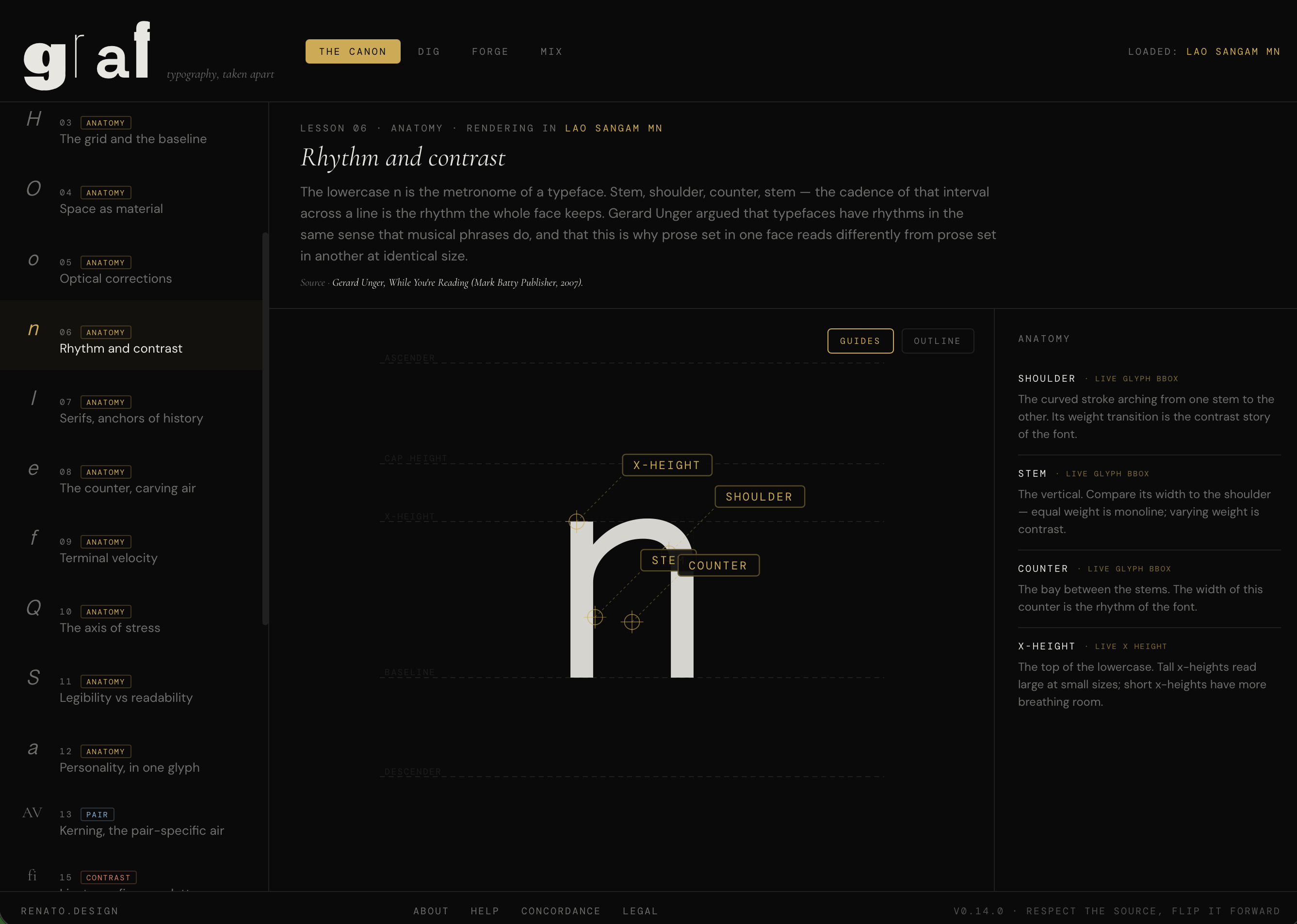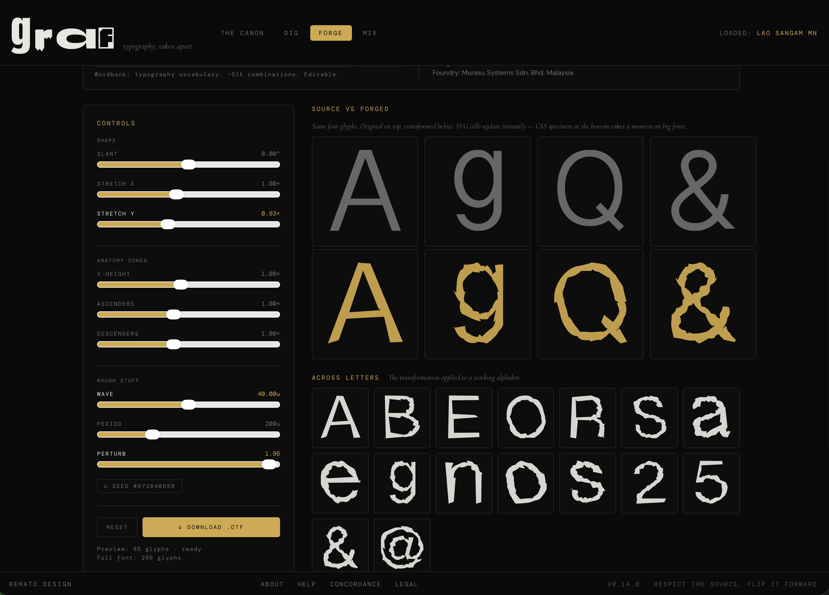 Built through Iterative LLM Co-Authorship — Phil Renato and Claude, trading drafts until the readings said what they meant. graf is a design thesis applied to itself: four wordmark faces at once. Each section cites the source it learned from, every derived font preserves every contributor’s credits in its own name table.