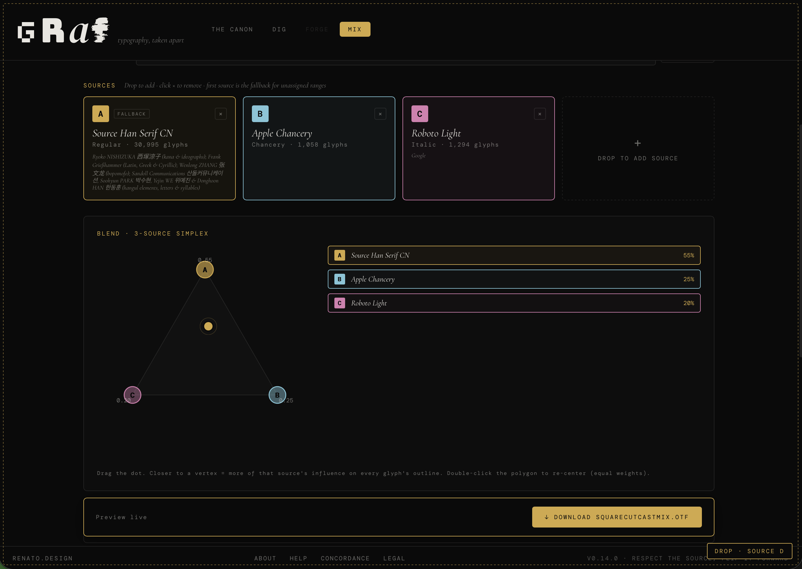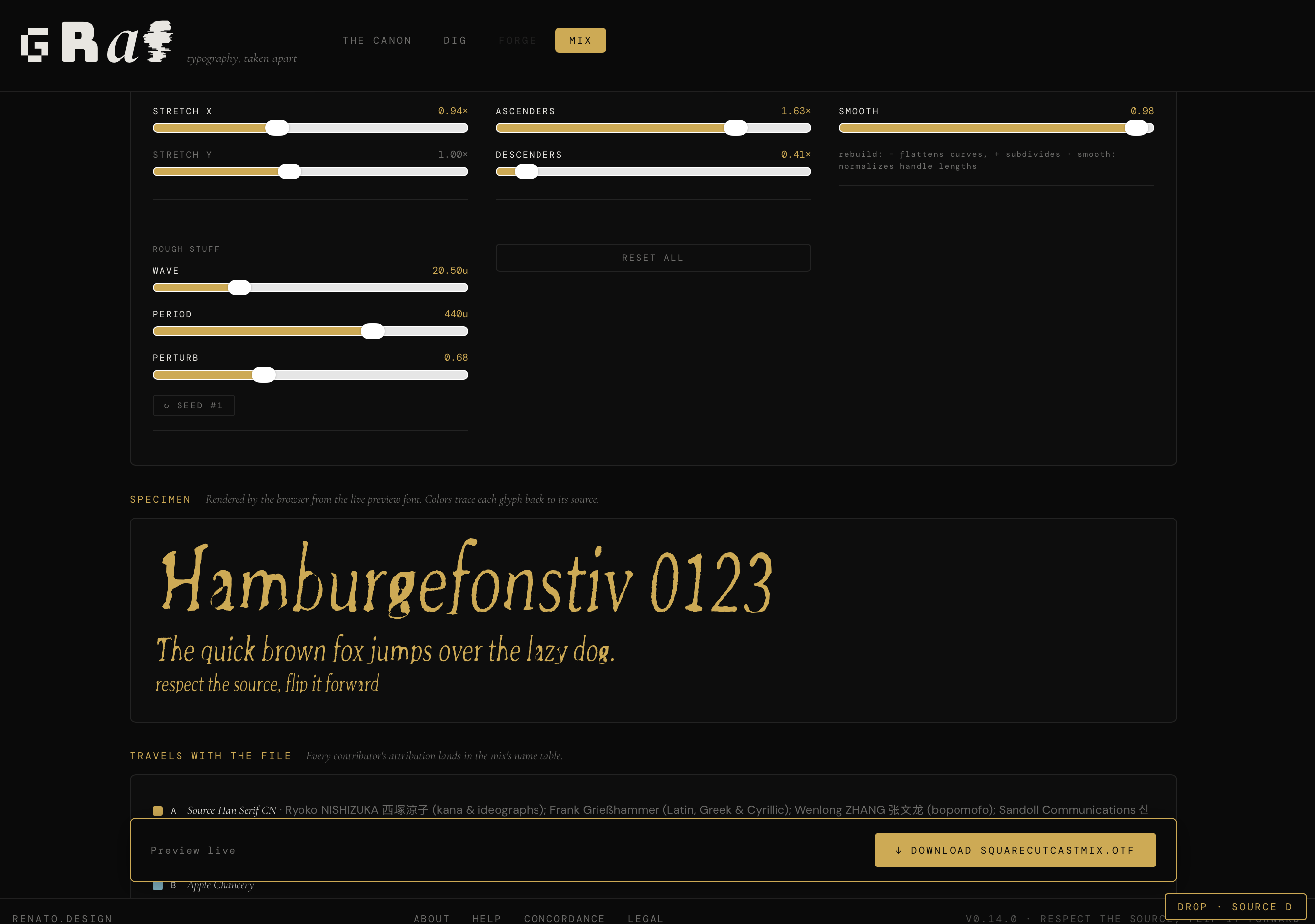On the way out, if you want one, graf drops a new font on you. Forge walks every glyph’s path commands, applying transforms. Mix interpolates outlines between two sources, or composes range-by-range across several. The output is a functional .otf — it installs in your operating system, sets type in Word, loads in Glyphs. Every source font’s copyright, license, designer, and foundry records travel verbatim in the output’s name table, plus a description line recording the transformation. Most licenses require that. Respecting the source is also just the posture.
