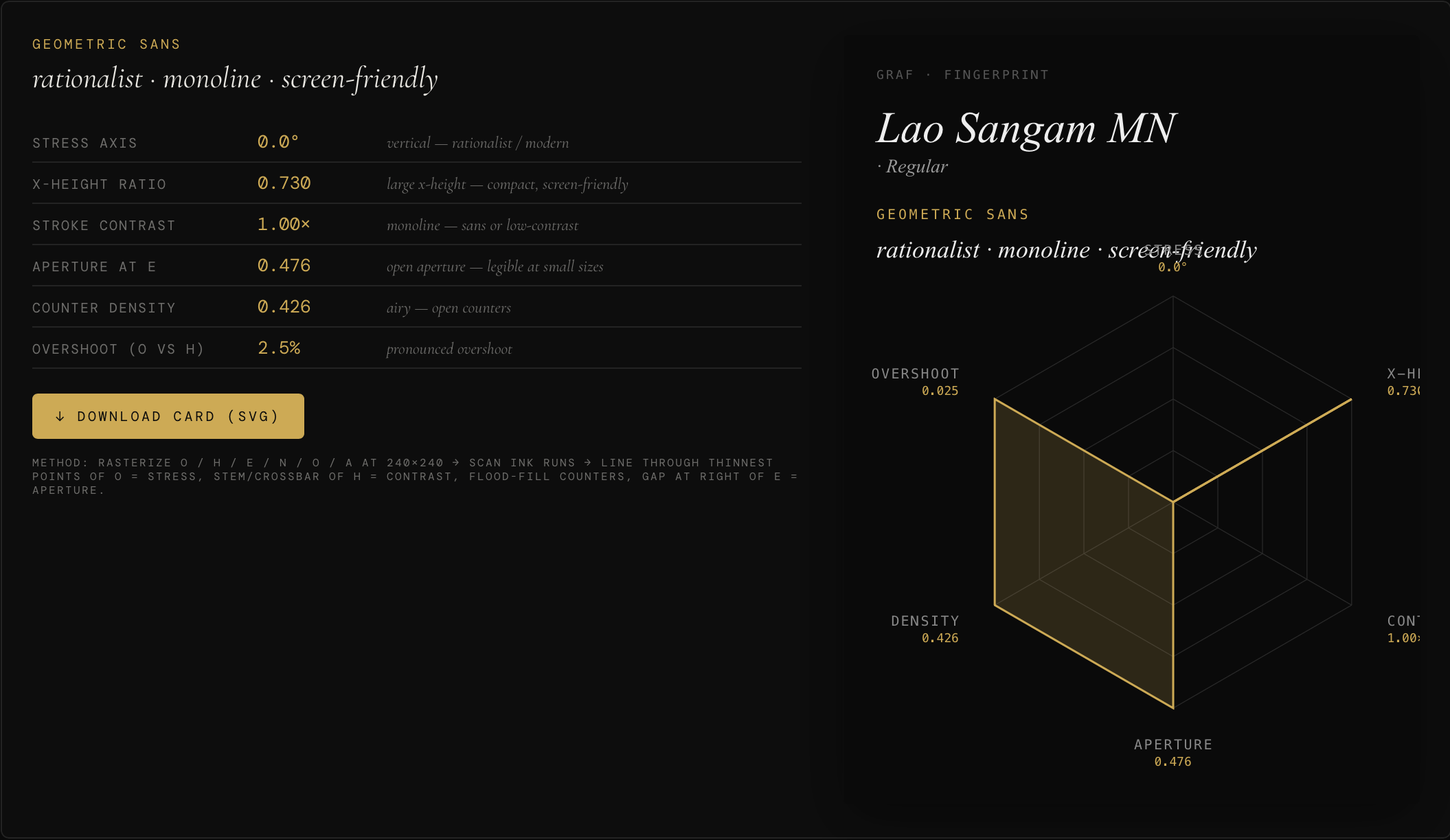Fingerprint. Rasterizes O, H, e, n, o, a to a 240×240 offscreen canvas and derives six measurements from the pixel runs and the font’s own tables: stress-axis angle (from the thinnest points of the O bowl), x-height ratio (from the os/2 table, raster fallback), stroke contrast (H stem ÷ crossbar), aperture at the e terminal, counter density (flood-filled across lowercase), and overshoot (O vs. H, in font units). Downloads as a standalone SVG card with a six-axis radar chart.
