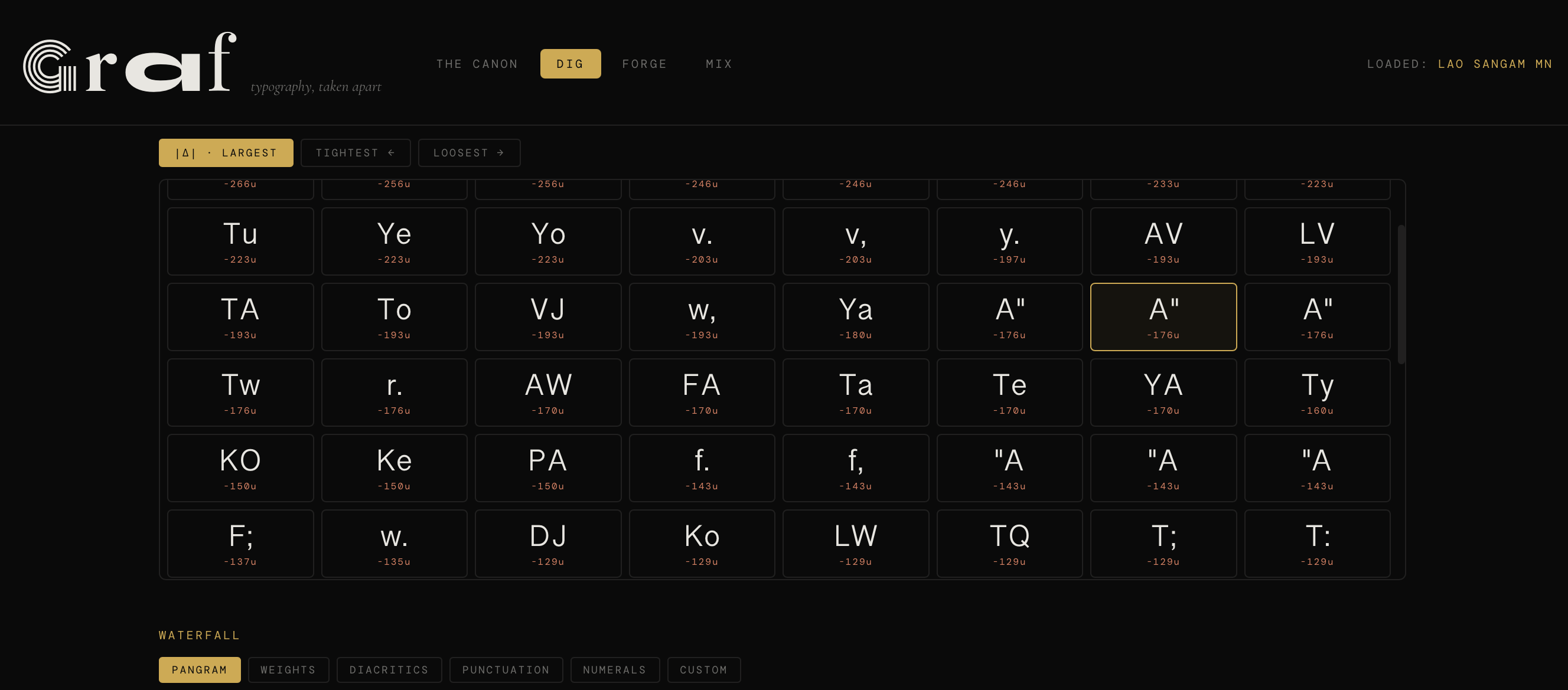 Pair Atlas. Enumerates every kerning pair the font ships — ≈6,400 candidate pairs queried through opentype.js’s getKerningValue. Filters to non-zero, sorts by magnitude, tightest, or loosest. Interactive preview with the font-shipped value plus ±300u adjustment. An empty atlas is also a verdict: some files simply don’t ship kerning.