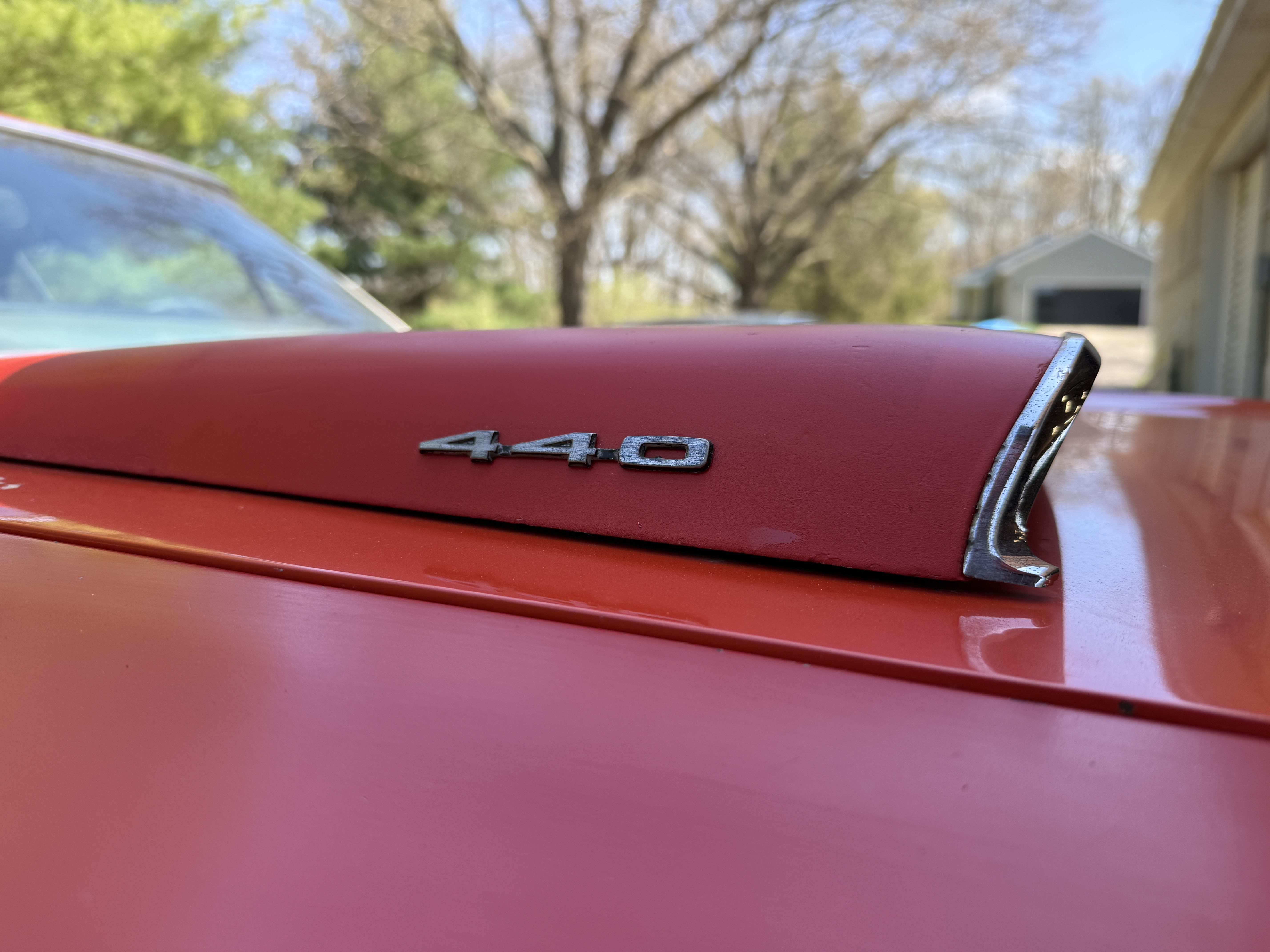 The 440 Six-Pack is a 440-cubic-inch Chrysler RB engine — a member of the Raised Block (RB) big-block family that also produced the 413 and 426 wedges — fitted with three two-barrel Holley 2300-series carburetors atop an aluminum Edelbrock intake manifold. Total carburetor airflow on a tuned-up Six-Pack is around 1,375 cfm; for context, a single Carter Thermo-Quad on a regular four-barrel 440 is rated about 800 cfm. The engine made 390 horsepower gross at 4,700 rpm and 490 lb-ft of torque at 3,200 rpm, in the period rating system.