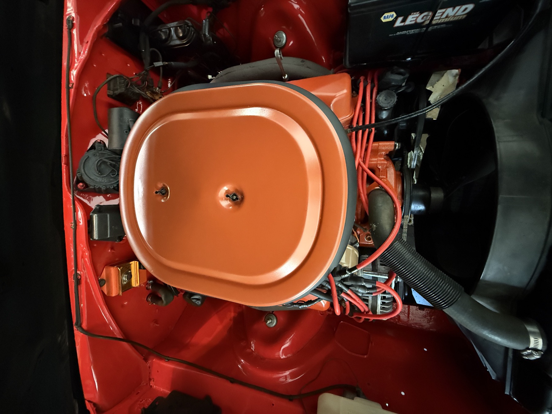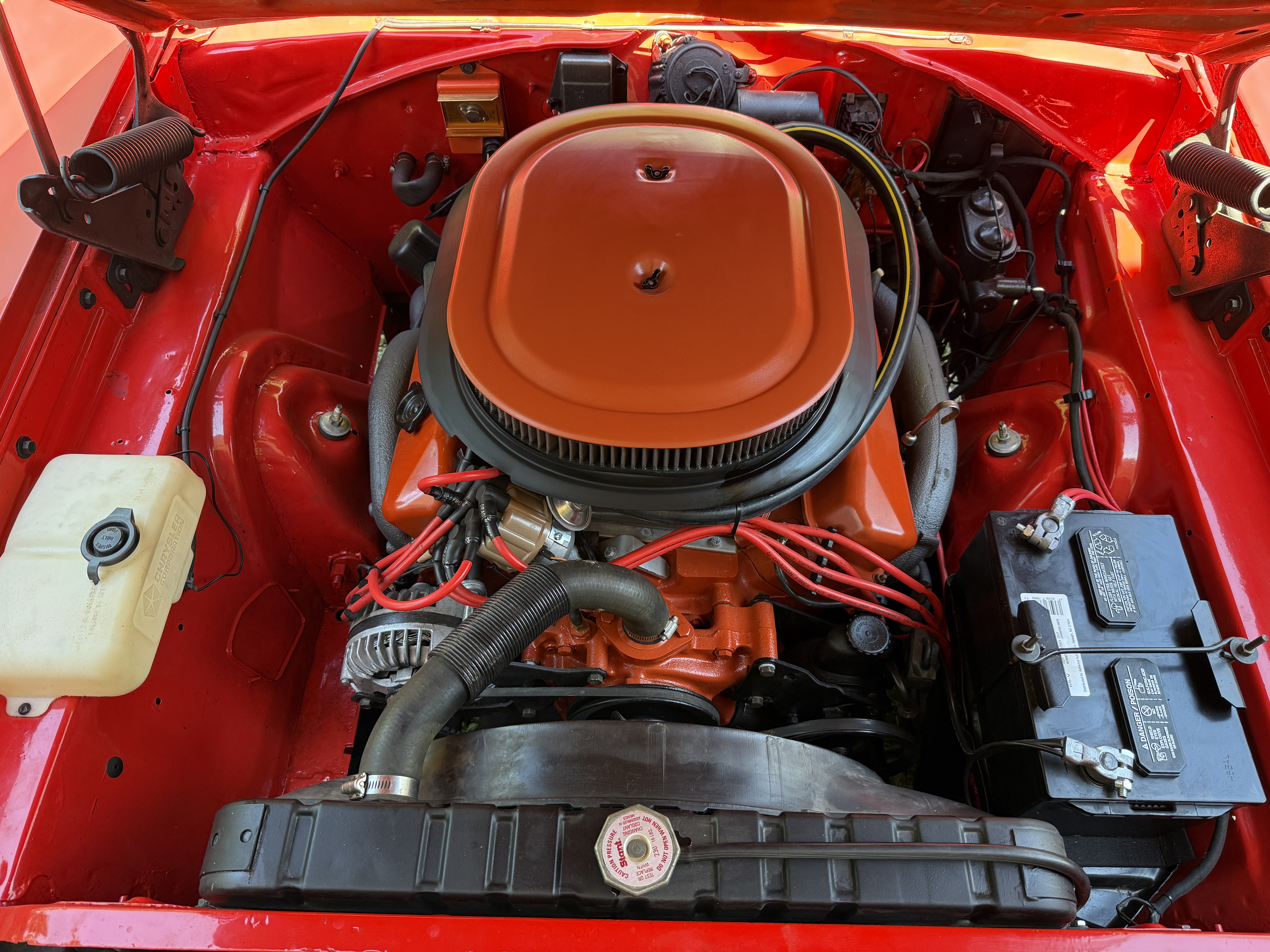 Mechanically the V-code engine differs from a U-code (single 4-barrel) 440 in valve springs, pushrods, the connecting rods (forged in 1970, with reinforced beams), the harmonic balancer, and of course the induction system. The center carburetor handles part-throttle operation; the outboard carbs are vacuum-actuated and open progressively as throttle and engine load demand. Properly tuned, the engine runs as a tractable street engine until the secondaries open, at which point all 1,375 cfm of carburetion is on tap.